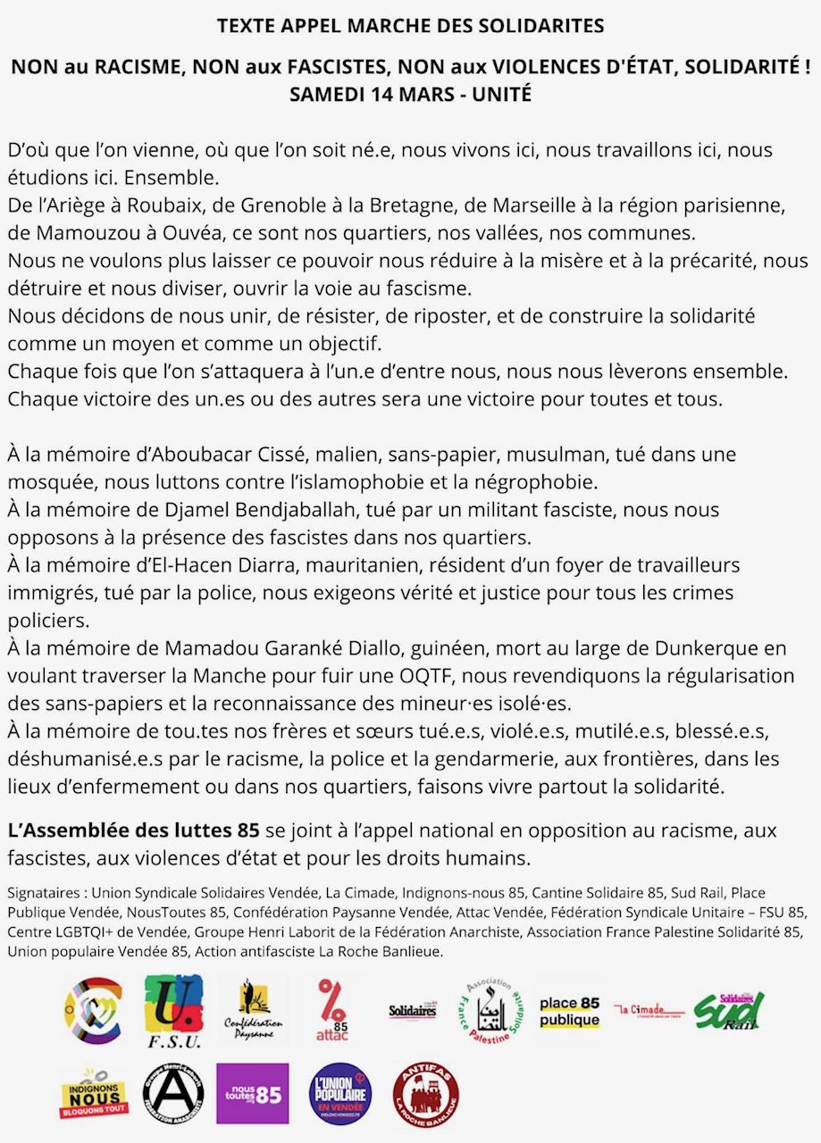 L’UD CGT85 apporte son soutien à la manifestation organisée par l’assemblée des luttes vendéenne, dans le cadre de la lutte anti raciste, anti fasciste et contre la violence d’état.